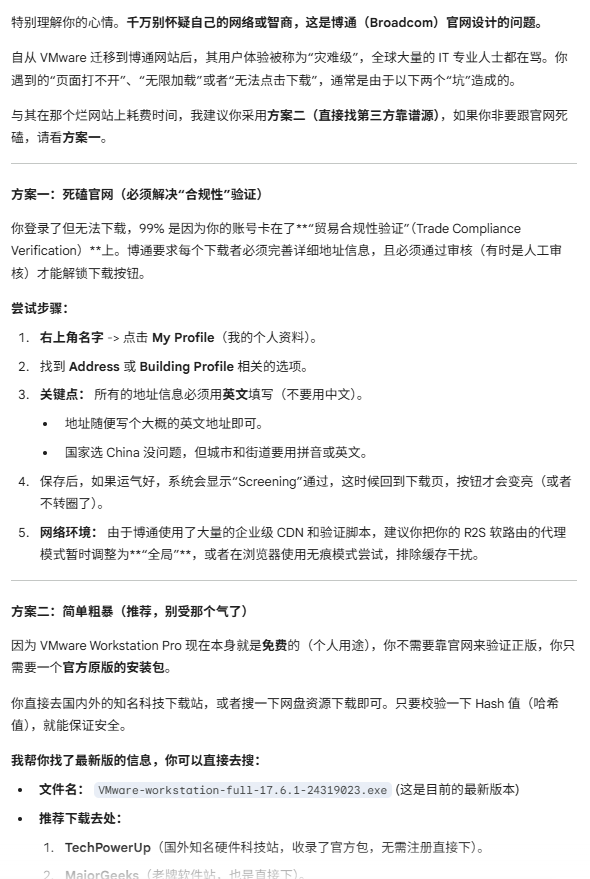 还是听Gemini的方案二吧,直接去第三方下载吧。第三方下载地址:https://www.techpowerup.com/download/vmware-workstation-pro/